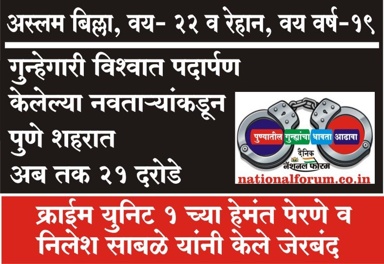 पुणे शहरातील सोमवार पेठ येथुन 8 हजार कोटीचे एमडी हा अंमली पदार्थ पकडून ज्यांनी अंमली पदार्थांची बाजारपेठ उध्वस्त केली, त्या क्राईम युनिट क्र. 1 यांनी त्यांच्या मानाच्या शिरपेचात आणखी एक मानाचा तुरा रोवला आहे. पुणे शहरातील गुन्हेगारी कारवायांना आळा घालण्यासाठी व गुन्हयावर नियंत्रण ठेवण्यासाठी पेट्रोलिंग करीत असतांना, हडपसर येथुन गुन्हेगारी विश्वात पदार्पण केलेल्या नवताऱ्यांना पकडून त्यांनी घातलेल्या 21 दरोड्यांचा उलगडा केला आहे. याकामी पोलीस अंमलदार हेमंत पेरणे व निलेश साबळे यांनी महत्वाची कामगिरी बजावली आहे.