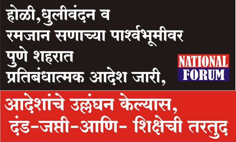 पुणे शहरात साजरा होत असलेल्या होळी, धुलिवंदन, रमजान सणांच्या पार्श्वभूमीवर पुणे शहर पोलीस आयुक्तालय कार्यक्षेत्रात सार्वजनिक शांतता आणि सार्वजनिक सुरक्षितता राखण्यासाठी महाराष्ट्र पोलीस अधिनियम सन-1951 च्या कलम 37 (1) (2) (3) अन्वये प्रतिबंधात्मक आदेश जारी करण्यात आले आहेत. तसेच प्रतिबंधात्मक आदेशांचे उल्लंघन करणाऱ्यांविरूद्ध दंडाच्या आकारणीसह जप्ती व शिक्षा केली जाणार असल्याची माहिती विशेष शाखेचे पोलीस उपआयुक्त डॉ. संदीप भाजीभाकरे यांनी दिली आहे. पुणे शहर पोलीस आयुक्तालयामार्फत प्रसिद्धीस देण्यात आलेल्या निवेदनात त्यांनी खालील प्रमाणे निदेश देण्यात आलेले आहेत.