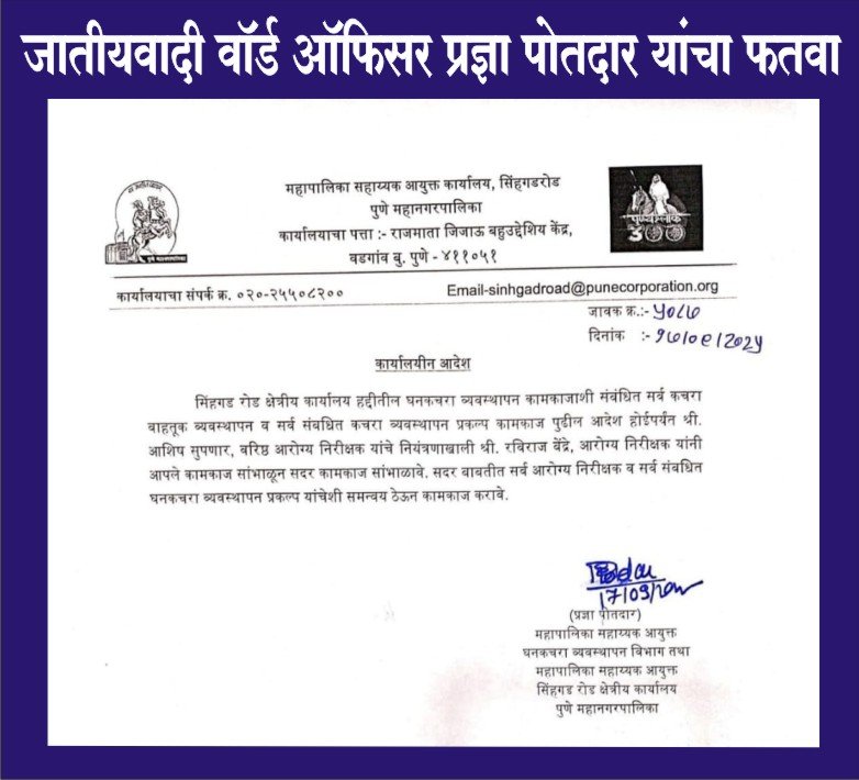 पुणे महानगरपालिकेच्या सिंहगड रोड क्षेत्रिय कार्यालय हद्दीत ज्या सोसायट्यांमध्ये बीडब्ल्युजी प्रकल्प सुरू आहेत, तसेच ज्या सोसायट्यांनी कंपोस्ट खत व ओला कचरा जिरवित असल्याबाबत, शिफासर घेवून, पुणे महापालिकेच्या मिळकत कर विभागाकडून, त्यांच्या मिळकत करामध्ये 5 टक्के सवलत मिळविली आहे, त्यांचा ओला कचरा मोकादम व आरोग्य निरीक्षक यांना उचलण्यास प्रतिबंध केल्यामुळे सिंहगड रोड क्षेत्रिय कार्यालयाच्या सहायक महापालिका आयुक्त श्रीमती प्रज्ञा पोतदार यांनी वरिष्ठ आरोग्य निरीक्षक (सिनिअर सॅनिटरी इन्सपेक्टर) श्री. मंगलदास माने यांच्याकडून कचरा वाहतुक व्यवस्थापन व कचरा व्यवस्थापन प्रकल्पाचा पदभार काढून घेण्यात आल्याचे कार्यालयीन आदेश जारी केले आहेत.