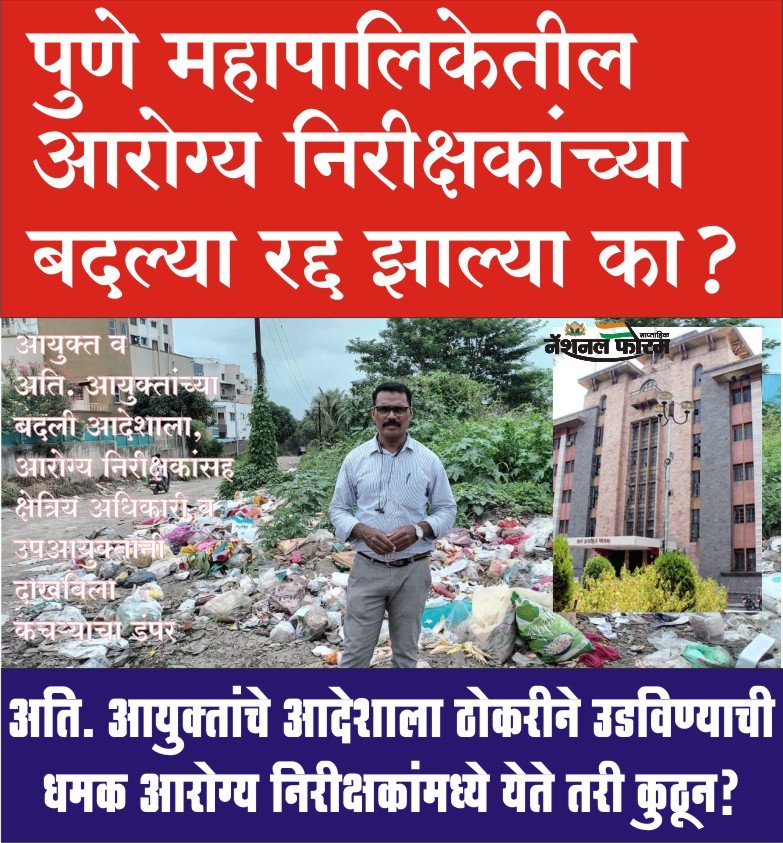 दरम्यान नॅशनल फोरम वृत्तपत्राने मागील 7/8 महिन्यांपासून पुणे महापालिकेतील मोकादम व आरोग्य निरीक्षकांच्या बदल्याचा मुद्दा लावून धरला होता. तसेच संबधित आरोग्य निरीक्षक (सॅनिटरी इन्सपेक्टर) बदलीच्या ठिकाणी का रुजु होत नाहीत, याची सखोल मिमांसा आयुक्त व अति. आयुक्तांना निवेदनाव्दारे कळविल्यानंतर, तसेच वारंवार बातम्या प्रसारीत केल्यानंतर, मात्र पुणे महापालिकेच्या आयुक्तांना देखील पुणे शहरातील कचऱ्याचे आणि कचरा प्रकल्पांचे रहस्य उलगडले. त्यामुळे आयुक्त श्री. नवल किशोर राम यांनी कधी नव्हे तर मागील 10 वर्षात प्रथमच आरोग्य निरीक्षकांच्या सार्वत्रिक बदल्या समुपदेशनाने केल्या. तरी देखील बहुतांश आरोग्य निरीक्षक बदलीच्या ठिकाणी रुजु झाले नाहीत. यामागे सहायक महापलिका आयुक्त म्हणजे वॉर्ड ऑफिसर यांचाच अडथळा ठरत आहे. वॉर्ड ऑफिसर आरोग्य निरीक्षकांना सोडण्यास तयार नाहीत, तसेच कुणी बदलीच्या ठिकाणी रुजु झाले तरी त्यांना आरोग्य कोठ्या देण्यात येत नाहीत. यामागे भल्लमोठ्ठ अर्थशास्त्र दडले असून, स्वतःचे आर्थिक गणित बिघडू नये यासाठी सर्वच चिंतेत असल्याचे मागील एक आठवड्यापासून मी स्वतः पाहत व अनुभवत आहे. महाराष्ट्र शासनाच्या बदली अधिनियमाची, घनकचरा विभागात एैशी की तैशी करण्यात आलेली आहे.