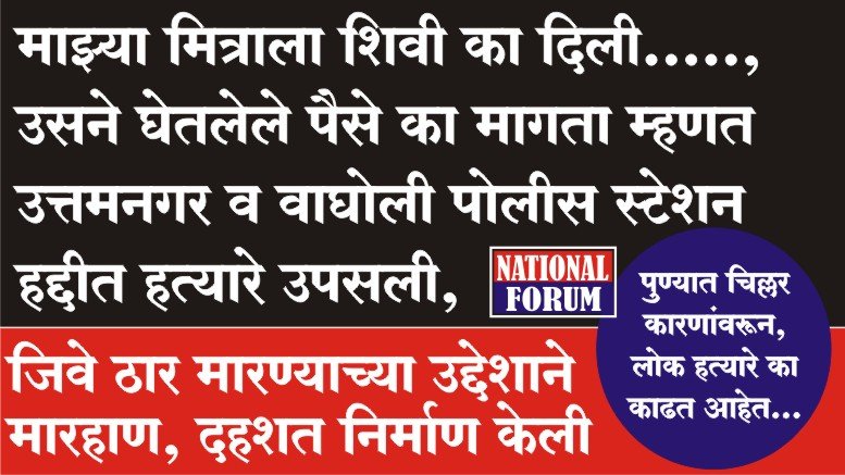 गुन्हा करण्यास किंवा गुन्हा घडण्यास काहीतरी ठोस कारण असल्याशिवाय, गुन्हा घडत नाही ही गुन्ह्याची व्याख्या असली तरी, आता मूळ गुन्ह्याची व्याख्याच बदलण्याची वेळ आली आहे. काहीतरी चिल्लर आणि थिल्लर कारणांवरून लोक गुन्हा करण्यास मागे-पुढे पाहत नाहीत. अशाच काही घटना आज पुणे शहरात घडल्या आहेत. वाघोली पोलीस स्टेशन हद्दीत माझ्या मित्राला शिवी का दिली म्हणून हत्यारे काढण्यात आली. जीवे ठार मारण्याच्या उद्देशाने मारहाण केली तर उत्तमनगर पोलीस स्टेशन हद्दीत तर तिसऱ्याने उधार घेतलेले पैसे का मागतो म्हणून तिथेही दुसऱ्याने हत्यारे काढुन दहशत निर्माण करण्याच्या घटना घडल्या आहेत. नागरिकांच्या मनांत कायदयाचा धाकच राहिला नसल्याचे या घटनांवरून दिसून येत आहे.